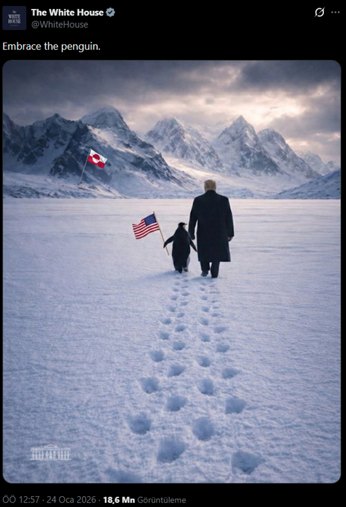 Beyaz Saray'ın resmi sosyal medya hesabından Grönland temalı 'penguen' paylaşımı sosyal medyada alay konusu oldu. Kullanıcılar, penguenlerin yaşamadığı Grönland hakkında paylaşım yapılmasını alay konusu haline getirerek 'utanç verici bir hata' yorumlarında bulundu.