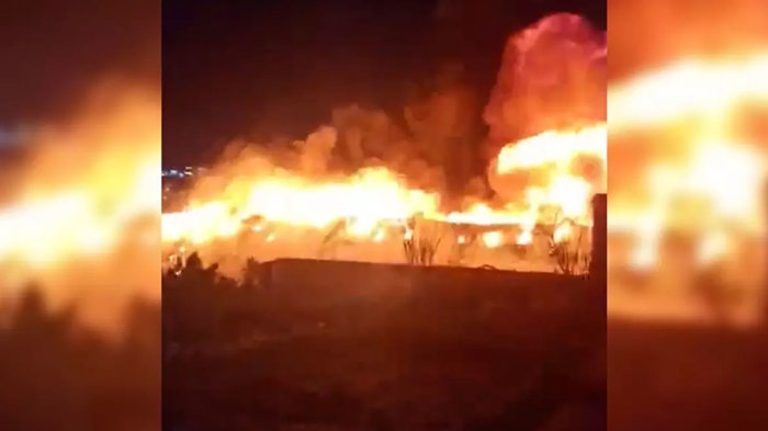 İsabet alan yerin ticari depo olduğu ve itfaiye ekiplerinin yangını söndürmeye çalıştığı aktarıldı.