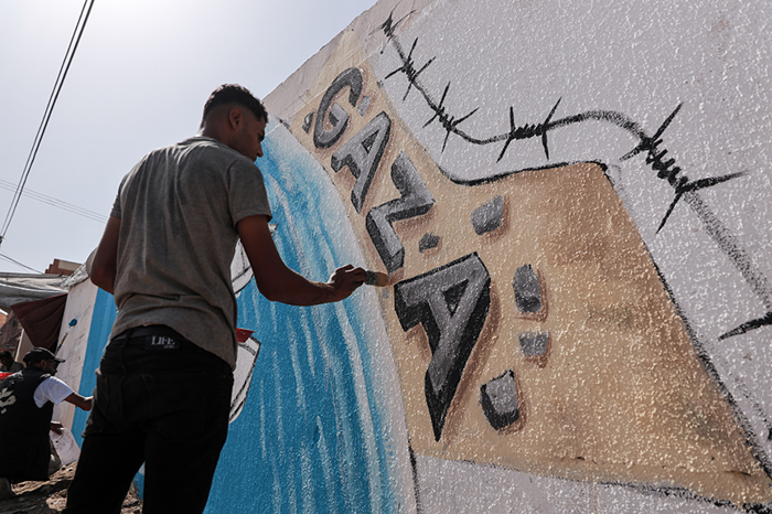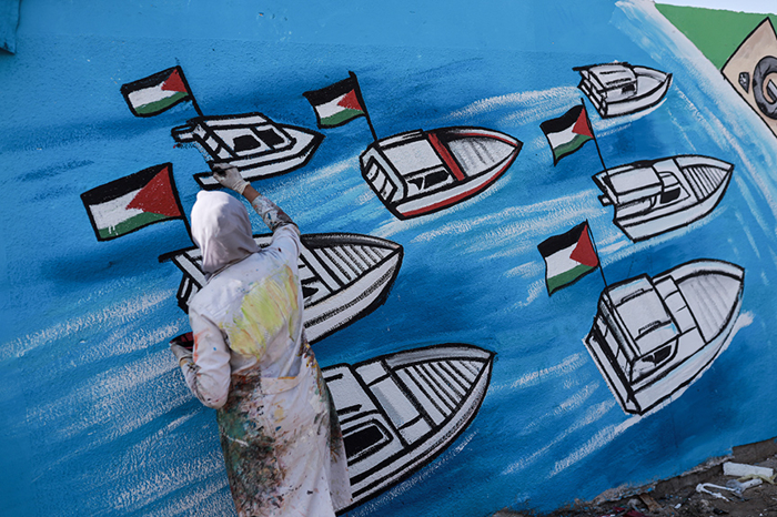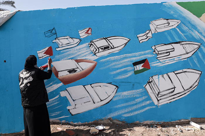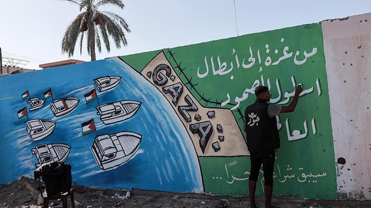 Filistinli bir grup ressam, "Küresel Sumud Filosu"na destek vermek için Gazze Şeridi'nin orta kesimindeki Deyr el-Belah kentinde bir duvara filonun resmini çizdi ve "Gazze'den Sumud Filosu'nun Kahramanlarına" yazısıyla teşekkür mesajı verdi.
