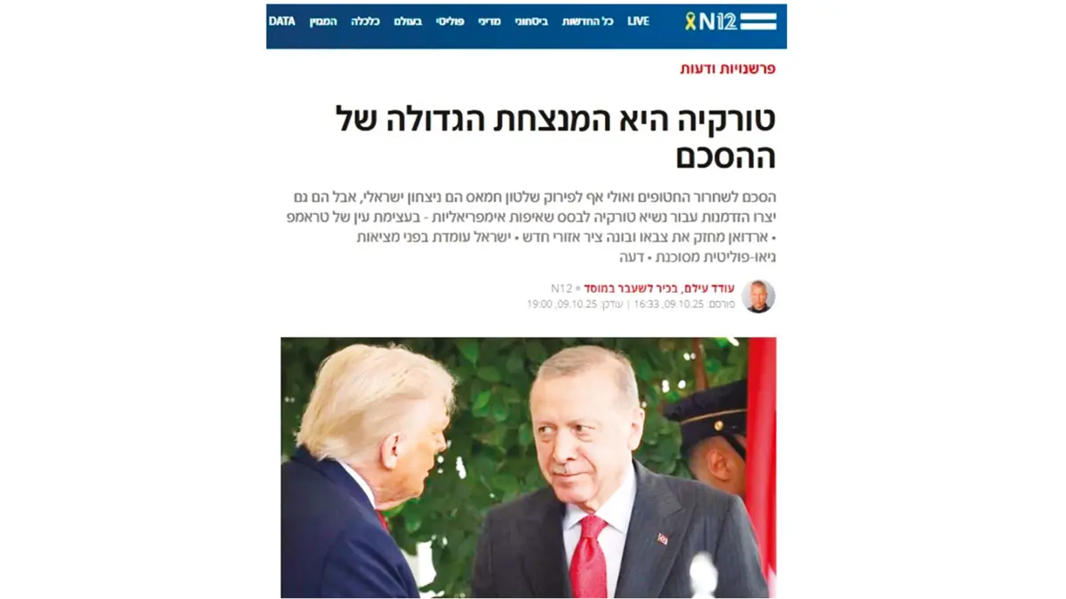 İsrail basını, Gazze'deki ateşkes sürecinde asıl kazananın Türkiye olduğunu yazdı. Haberlerde, “Diplomatik söylem artık Ankara'ya kayıyor. Türkiye geçici bir arabulucu değil, yeni düzenin baş aktörü” ifadelerine yer verdi.