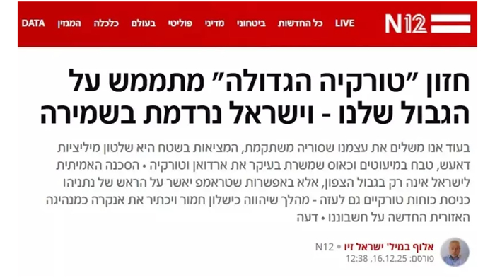 İsrail'in önde gelen televizyon kanallarından N12, Türkiye'nin Suriye'de artan etkisini mercek altına aldığı haberinde, İsrail'in bu süreçte yetersiz kaldığı yönünde değerlendirmelerde bulundu.