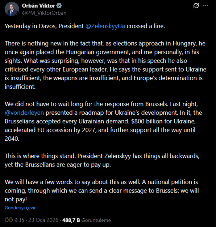 Açıklamasına "Zelenski Davos'ta çizgiyi aştı" diyerek başlayan Orban, "Macaristan'da seçimler yaklaşırken, yine Macar hükümetini ve beni şahsen hedef alması yeni bir şey değil. Ancak şaşırtıcı olan konuşmasında her Avrupa liderini eleştirmesiydi. Gönderilen desteğin yetersiz olduğunu, silahların yetersiz olduğunu ve Avrupa'nın kararlılığının yetersiz olduğunu söylüyor" dedi.