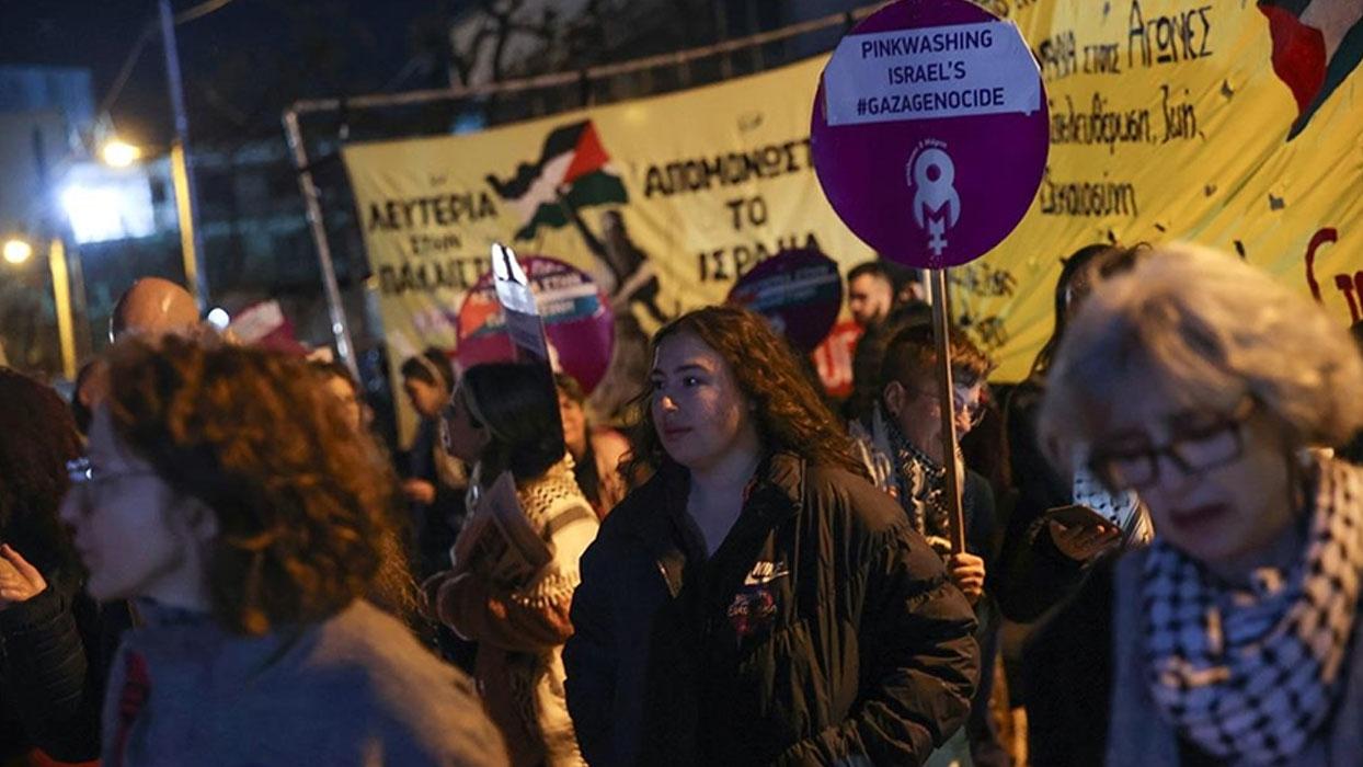 Filistin destekçileri, Soykırımcı İsrail'in 2026 Eurovision Şarkı Yarışması'na katılımını Yunanistan'ın başkenti Atina'da protesto etti.