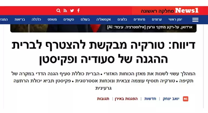 ABD basının Türkiye-Pakistan- Suudi Arabistan savunma ittifakı iddiası soykırımcı İsrail'in yayın kuruluşlarının da gündemine girdi. "Türkiye, Suudi Arabistan-Pakistan savunma ittifakını katılmayı hedefliyor" başlığıyla haber yayımlayan İsrail basını News1, ""ABD basını çarpıcı bir ittifak iddiasında bulundu. Türkiye-Suudi Arabistan-Pakistan üçlüsü arasında bahsedildiği gibi bir ittifak gerçekleşirse sessizce kurulan bu güç, bir ülkeye yapılan saldırının tüm ülkelere yapılmış sayılacağı karşılıklı bir savunma anlaşmasıdır." dedi.