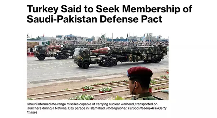 ABD merkezli yayın kuruluşu Bloomberg, Türkiye'nin Suudi Arabistan-Pakistan Savunma Paktı'na üye olmak isteğini öne sürdü. ABD basını konuya ilişkin haberinde, 3 ülkenin savunma ittifakında güçlerini birleştirebileceğine dikkati çekerek ittifakın "Birine saldırı, hepsine saldırıdır" mottosuyla kurulacağını vurguladı.