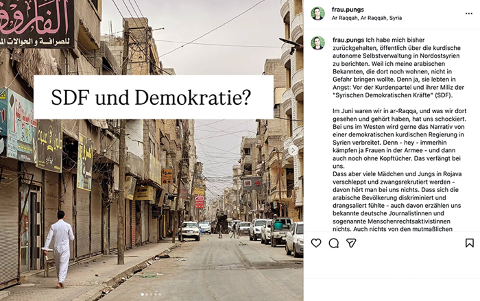 Pungs, terör örgütü YPG'nin yolsuzlukları, keyfi tutuklamaları, işkenceleri, zorla alıkoymaları ve muhaliflere yönelik baskılarının Batı'daki bazı gazeteciler ve insan hakları aktivistleri tarafından dile getirilmediğinin de altını çizdi.