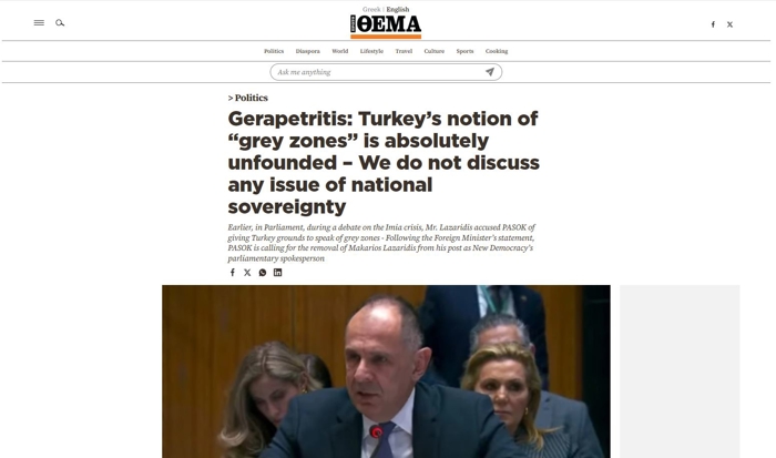 Yeni Demokrasi Partisi'nin Parlamento Sözcüsü Makarios Lazaridis, İmya'daki olaylar üzerine bugün yapılan parlamento tartışmasında PASOK'u Türkiye'ye gri bölgelerden bahsetme ve "Mavi Vatanlar" hakkında anlatılar oluşturma zemini vermekle suçladı. Bu konuya ilişkin New York'ta Yunan devlet televizyonu ERT'nin soruları cevaplayan Gerapetritis, Yunan Parlamentosu'ndaki tartışmaya seviye atlattı.