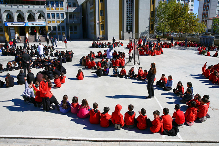 Ankara Haydar Aliyev Ortaokulu'nda da MEB Arama ve Kurtarma Birimi (AKUB) Ankara üyeleri, Afet ve Acil Durum Yönetimi Başkanlığı (AFAD) il müdürlüğü personeli ve Ankara Büyükşehir Belediyesi (ABB) itfaiye birimi tarafından afet farkındalık eğitimi düzenlendi, deprem tahliye ve yangın söndürme tatbikatları yapıldı.