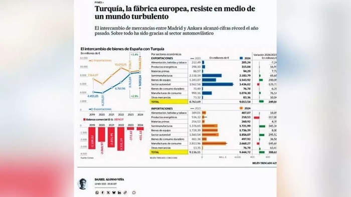 İspanyol El Pais gazetesi, jeopolitik gerginlikler, ABD'nin ek gümrük vergileri, Çinli üreticilerin rekabeti nedeniyle Avrupalı şirketlerin üretim ve tedarik ağlarını Türkiye'ye kaydırdığını yazdı. El Pais analizine göre Türkiye, sadece bir üretim üssü değil, aynı zamanda Avrupa'nın tedarik güvenliğinde stratejik bir ortak.