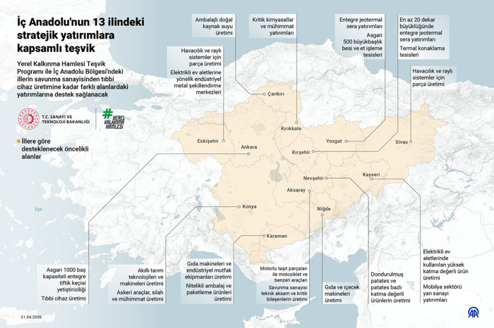 Sanayi ve Teknoloji Bakanlığı koordinasyonunda yürütülen Yerel Kalkınma Hamlesi Teşvik Programı ile İç Anadolu Bölgesi'ndeki illerin savunma sanayisinden tıbbi cihaz üretimine kadar farklı alanlardaki yatırımlarına destek sağlanacak.