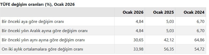 TÜFE'deki (2025=100) değişim 2026 yılı Ocak ayında bir önceki aya göre %4,84 artış, bir önceki yılın Aralık ayına göre %4,84 artış, bir önceki yılın aynı ayına göre %30,65 artış ve on iki aylık ortalamalara göre %33,98 artış olarak gerçekleşti.