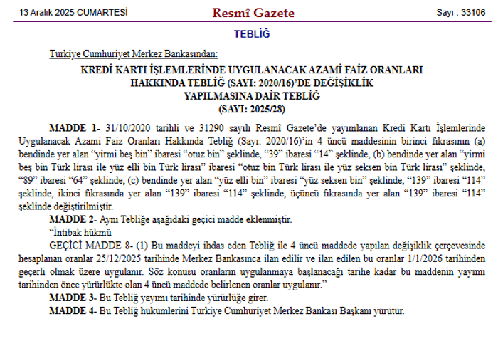 Güncellenmiş azami faiz oranları, TCMB tarafından 25 Aralık'ta ilan edilecek. Oranlar, 1 Ocak 2026 itibarıyla tüm kredi kartı ürünlerinde geçerlilik kazanacak.