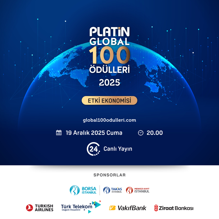'Türkiye'nin En Dinamik Aylık Ekonomi ve İş Dünyası Dergisi' mottosuyla 27 yılı başarıyla geride bırakan Platin, Türkiye'nin Global 100 endeksinde ülkemizi uluslararası arenada başarıyla temsil eden şirketleri bu yıl “Etki Ekonomisi” temasıyla ödüllendiriyor. Cumhurbaşkanlığı Yatırım ve Finans Ofisi Başkanı A. Burak Dağlıoğlu ve Ticaret Bakanı Prof. Dr. Ömer Bolat'ın teşrifleriyle gerçekleşecek Platin Global 100 Ödülleri; 19 Aralık Cuma günü saat 20.00'de 24 TV'de canlı yayınlanacak.