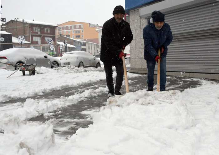 Gece saatlerinde başlayan ve etkisini sürdüren kar, yaşamı olumsuz etkiliyor. Vatandaşlar ev ve iş yerlerinin önünde birken karları temizledi.