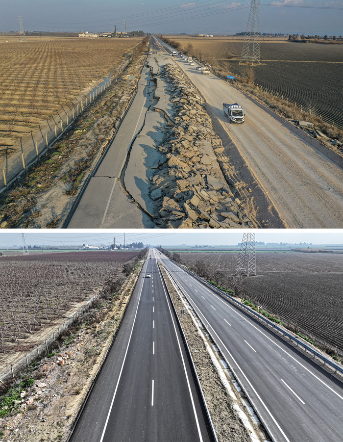 Deprem sabahı derin yarıklar oluşan Antakya-Reyhanlı kara yolunun Demirköprü mevkisindeki bölümü de 3 yıl sonra kullanılabilir durumdaki haliyle kaydedildi.