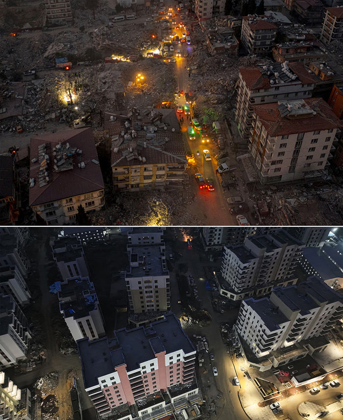 Hatay'da 6 Şubat 2023'te meydana gelen depremlerdeki yıkımın fotoğraf ve videoları ile afetin üçüncü yılında aynı açıyla havadan kayda alınan görsellerin birleşimi, şehirde inşa çalışmalarında gelinen noktayı ortaya koydu.