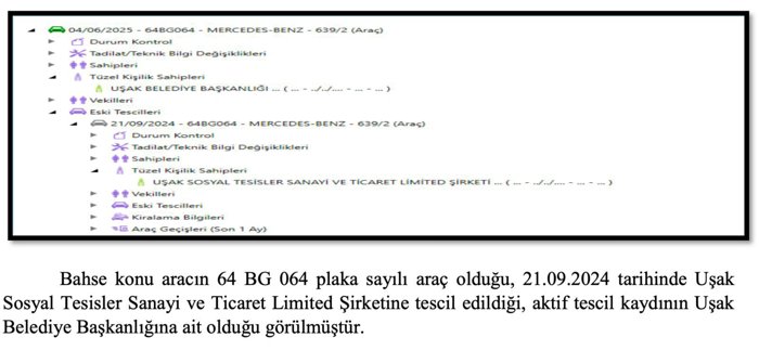 İkinci araçla ilgili yapılan sorgulamalarda sistem "yetki yok" uyarısı verdi. Ancak Mali Suçlarla Mücadele birimleri üzerinden yapılan incelemede gizlenen kayıt açıldı ve aracın CHP Genel Başkanı Özgür Özel adına kayıtlı olduğu kesinleşti. Bu bulgu, "Uşak Belediyesi kasasından çıkan parayla Özgür Özel'in aracına VIP dönüşüm yapıldığı" iddiasını doğrudan soruşturma evrakına giren somut tespitler arasına taşıdı.