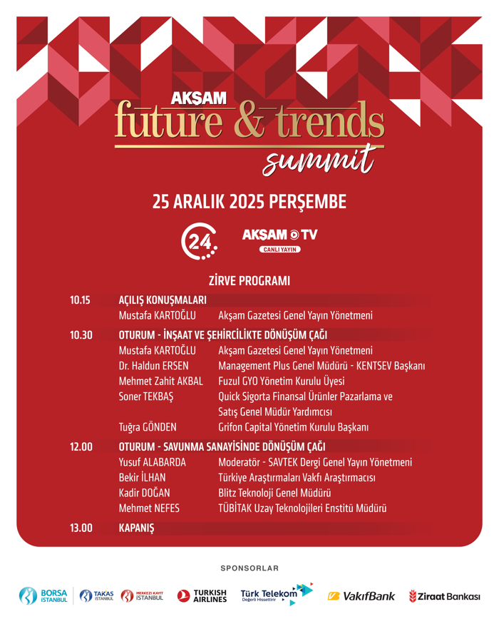 Borsa İstanbul, Takas İstanbul, Merkezi Kayıt Kuruluşu, Turkish Airlines, Türk Telekom, VakıfBank ve Ziraat Bankası sponsorluğunda Akşam Gazetesi tarafından düzenlenen Akşam Future&Trends Summit, bugün saat 10.15 itibarıyla izleyiciyle buluşacak.