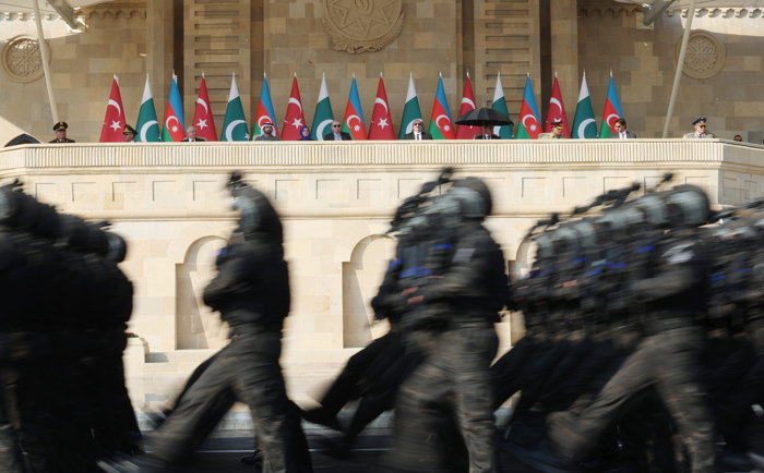 Pakistan'ın Azerbaycan'a Vatan Savaşı sırasında destek gösterdiğini hatırlatan Aliyev, "Bugün ilk kez Azadlık Meydanı'nda Pakistan askerleri de bizimle birlikte yürümektedir. Bu, 3 ülkenin, Azerbaycan, Türkiye ve Pakistan halklarının ve ordularının birliğinin bir göstergesidir. Dost ülkelerden gelen bütün misafirleri selamlıyorum. Onların bugün bizimle birlikte olmaları, birliğimizi, dayanışmamızı ve karşılıklı desteğimizi açık biçimde ortaya koyuyor. 1990'lı yılların başlarında Ermenistan'ın Azerbaycan'a karşı yürüttüğü işgal siyaseti sonucunda topraklarımızın yaklaşık yüzde 20'si işgal altına düşmüştü. 1 milyon Azerbaycan vatandaşı mülteci ve göçkün durumuna düşmüştü. Halkımıza karşı savaş suçları işlenmişti. Hocalı soykırımı gerçekleştirilmişti. Etnik temizlik politikası yürütülmüştü. Ama bu, bizim irademizi kıramadı" diye konuştu.