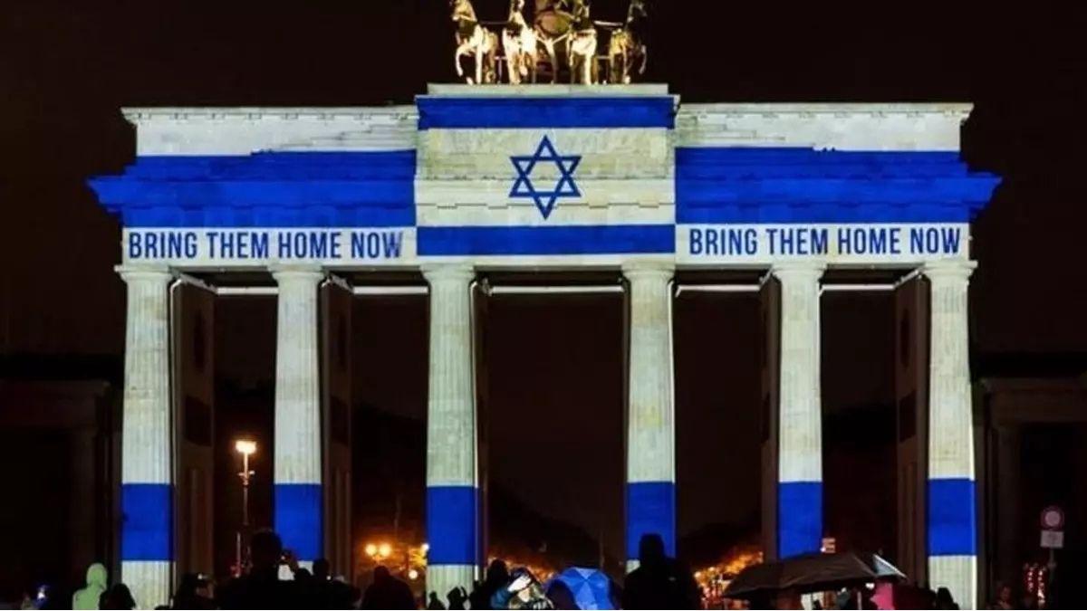 Almanya'nın Berlin şehrinde, kentin ana sembollerinden biri olan Brandenburg Kapısı'na, 7 Ekim 2023 tarihinden itibaren Gazze'de soykırım gerçekleştiren ve Filistin halkını katleden katil İsrail'in bayrağı yanıstıldı.
