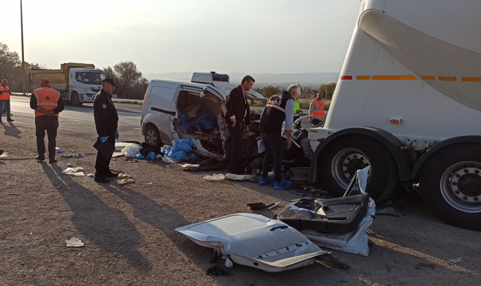 Hafif ticari araçta sıkışan sürücü ile eşi Kinem (26) ve 1 yaşındaki bebekleri Lorin Yalçın, itfaiye ekibince bulundukları yerden çıkartıldı.