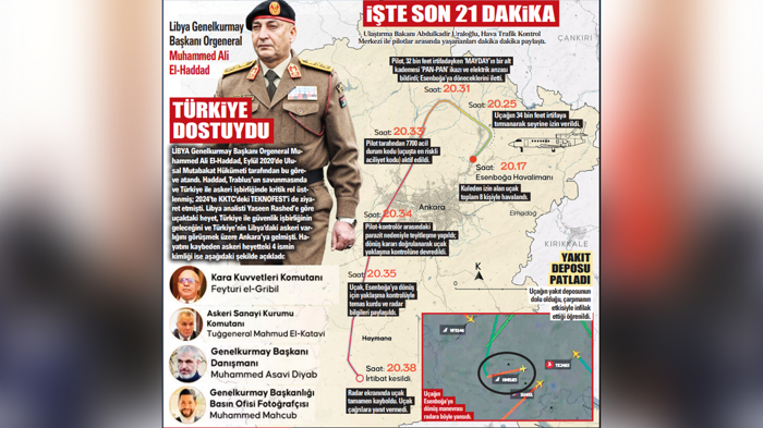 Libya Genelkurmay Başkanı Orgeneral Muhammed Ali Al-Haddad dâhil 5 kişilik askeri heyeti taşıyan Falcon-50 tipi özel jetin Haymana'da düşmesiyle ilgili yeni bilgilere ulaşıldı. Ankara Esenboğa Havalimanı'ndan Trablus'a gitmek üzere saat 20.17'de havalanan uçağın 32 bin 400 fit irtifaya ulaştıktan sonra hava kontrol merkeziyle irtibat kurduğu; elektrik arızasından kaynaklı 'acil durum' bildirdiği öğrenildi. 'Acil iniş' talebinde bulunarak geri dönen uçak, Haymana'ya bağlı Kesikkavak Köyü'nün 2 km güneyindeki bir tepeye düştü. Enkaz bölgesinde basın açıklaması yapan İçişleri Bakanı Ali Yerlikaya, kaza-kırım nedeniyle 3'ü mürettebat 8 kişinin hayatını kaybettiği belirtti.