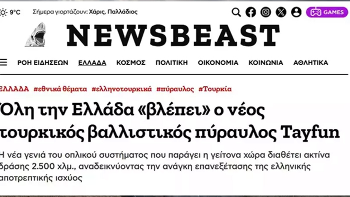 Yunanistan basını, Türkiye'nin geliştirdiği Tayfun balistik füzesinin menzil ve hız kapasitesiyle Yunanistan'ın tamamını kapsadığını yazdı. Atina merkezli analizlerde, bu gelişmenin Yunanistan'ın mevcut caydırıcılık doktrinini geçersiz kıldığı ve kritik askeri altyapıyı risk altına soktuğu vurgulandı.