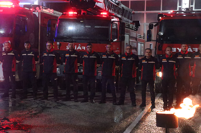 Deprem bölgesinde görev alan Burdur Belediyesi İtfaiye Müdürlüğü personeli, komuta merkezinde saatler 04.17'yi gösterdiğinde araçlarının sirenlerini çalarak saygı duruşunda bulundu.