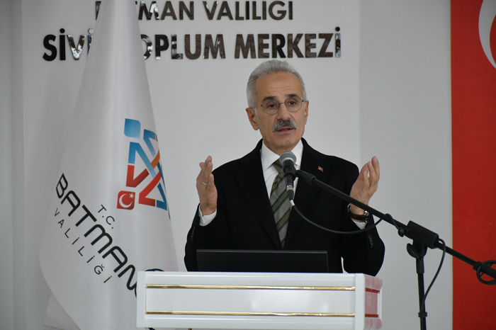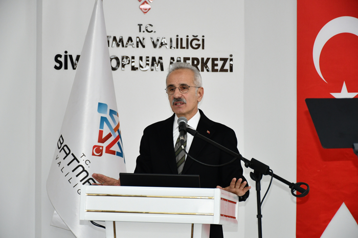 "Diktepe Geçişi dahil Batman-Diyarbakır, Batman-Hasankeyf-Gercüş-Midyat, Batman-Silvan-Kozluk Ayrımı Gap yolu gibi 6 önemli kara yolu projesinde de çalışmalarımızı yürütüyoruz. Diktepe Köprüsü'nü bitirdik. Devamındaki bağlantı yollarını da önümüzdeki aylar içerisinde bitirerek tamamen sizlerin hizmetine sunacağız. Diyarbakır-Batman yolundaki çalışmalarımız da önemli bir aşamaya geldi. Bu proje kapsamındaki Batman Çayı Köprüsü'nü tamamladık. Şehrimizin demir yolu ağını komple yeniledik. Sinan-Batman arası 6,5 kilometrelik demir yolu deplasmanını tamamladık. Yolçatı, Diyarbakır, Batman, Kurtalan hattını elektrikli ve sinyalli hale getirmek için proje çalışmalarına da başladık. 2010'da Batman Havalimanı yeni terminal binasını hizmete açarak yolcu kapasitesini 2 milyona çıkardık. 2008'de yaklaşık 9 bin olan yolcu trafiği, 2025'te 735 binin üzerine çıkmış durumda. Bugün 4 ayrı hava yolu şirketiyle İstanbul, Sabiha Gökçen, Esenboğa ve Adana Menderes havalimanlarına haftalık 62 sefer yapılıyor. Bu yıl nisan ayı itibarıyla Antalya-Batman hattında da inşallah seferleri başlatacağız. Bunlar da hayırlı uğurlu olsun."