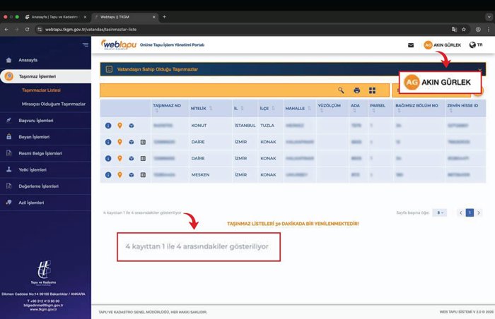 Bakan Gürlek'in, açıklamalarının ardından, web tapuda üzerine kayıtlı taşınmazları gösteren belgenin kopyası gazetecilerle paylaşıldı.
