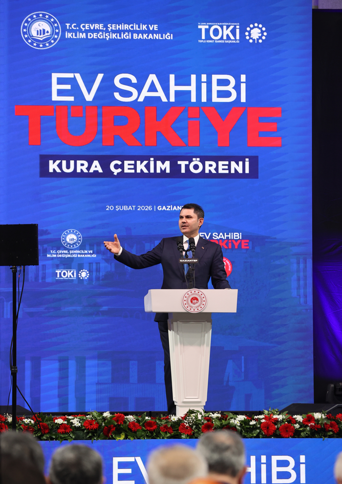"Ev Sahibi Türkiye" kura çekim töreninde konuşan Çevre, Şehircilik ve İklim Değişikliği Bakanı Murat Kurum, "Saatte 23, günde 550 konut üretecek tecrübeye, birikime ve azme sahip Türkiye'den başka bir ülkeden söz dahi edilemez." dedi
