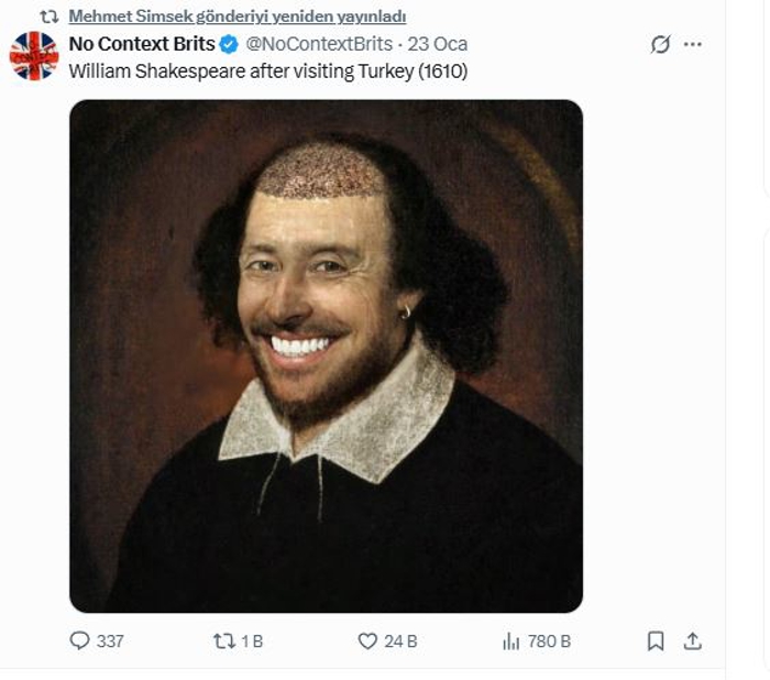 "No Context Brits" isimli hesaptan yapılan paylaşımda, ünlü yazar William Shakespeare'in görseli ile Türkiye'nin sağlık turizmine atıf yapılarak "William Shakespeare, Türkiye'yi ziyaret ettikten sonra (1610)" ifadeleriyle paylaşıldı. Paylaşılan görselde ise Shakespeare'in dişleri ve saçları dikkat çekti.