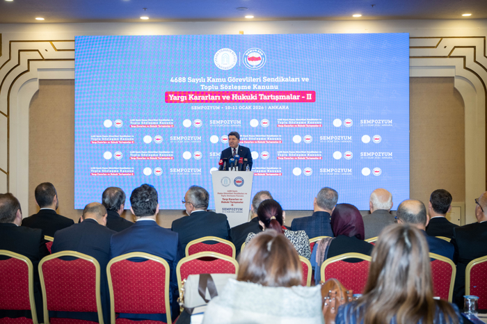 Tunç, Memur-Sen ile Ankara Yıldırım Beyazıt Üniversitesi işbirliğinde Kızılcahamam'daki otelde düzenlenen "4688 Sayılı Kamu Görevlileri Sendikaları ve Toplu Sözleşme Kanunu-Yargı Kararları ve Hukuki Tartışmalar" Sempozyumu'nda konuştu.