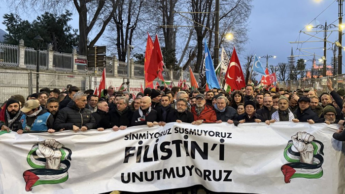 'Sinmiyoruz, susmuyoruz, Filistin'i unutmuyoruz' mitingi için sabah namazında camilerde bir araya gelen on binlerce katılımcı, kortejlerle Galata Köprüsü'ne doğru yürüyüşe başlarken Bakanlar kortejlerin ön safında yer aldı.