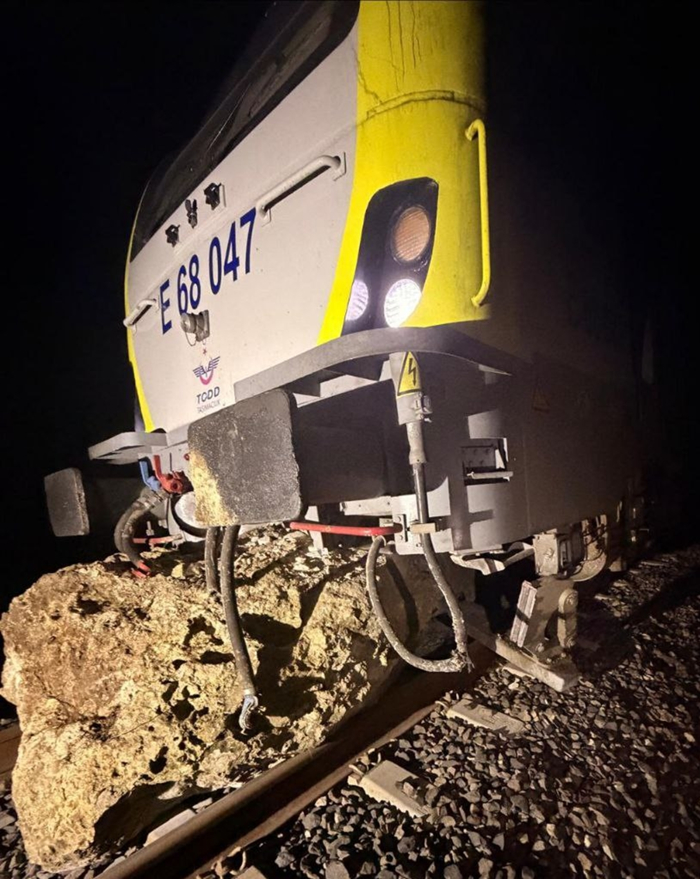 Balıkesir'in Savaştepe ilçesinde seyir halindeki bir yolcu treninin lokomotifi, hat üzerine düşen kaya nedeniyle raydan çıktı.