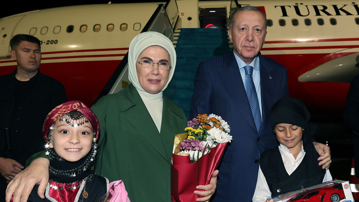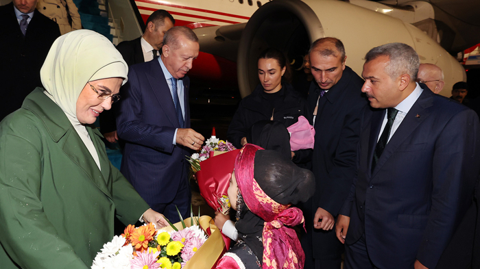 Merkez Camisi önünde kendisini bekleyen hemşehrilerini eşi Emine Erdoğan ile selamlayan Cumhurbaşkanı Erdoğan, makam aracından inerek, otobüse geçti.