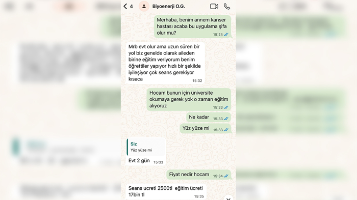 O.G. isimli bir başka kişi ise kanser gibi ağır hastalıklara dahi şifa olabileceğini öne sürerek, "Uygulama şifa olabilir ancak uzun bir yol. Aileden bir kişiye eğitim verilirse süreç hızlanabilir" dedi. O.G., seans ücretini 2 bin 500 TL, eğitim ücretini 17 bin TL olarak açıkladı. Görüşmelerin hastane ya da klinik yerine ofis ortamında yapıldığı belirtildi. N.I. isimli bir kadın ise, "Tedavi değil, alternatif yöntem diyoruz; biyoenerji uzmanı değil, biyoenerji uygulayıcısı diyoruz" ifadeleriyle 2 bin 950 TL'ye online eğitim pazarladı.