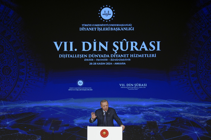 Diyanet İşleri Başkanlığı Konferans Salonu'nda düzenlenen 7. Din Şurası'nda konuşan Erdoğan, başta Kur'an-ı Kerim olmak üzere Hazreti Peygamber'e, onun hadis-i şeriflerine, yaşantısına, asırlardır yollarını aydınlatan alimlere, toprakları iman ve hikmetle yeşerten gönül insanlarına, medya ve sosyal medya üzerinden sistematik saldırılar gerçekleştirildiğini belirtti.