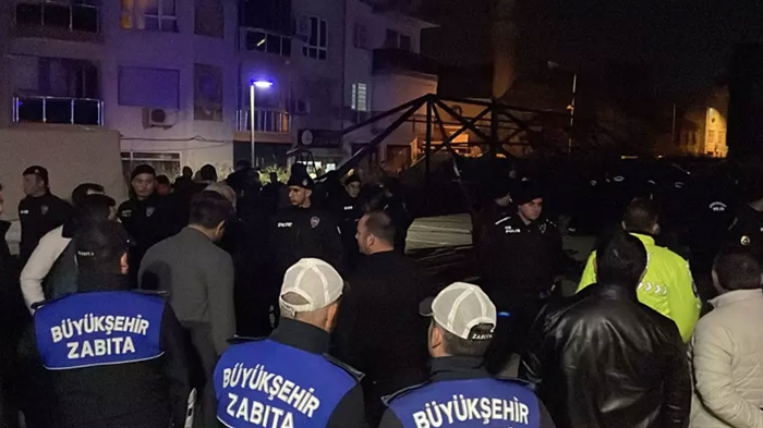 Kuşadası Türkmen Mahallesi'nde Aydın Büyükşehir Belediyesine ait araziye Kuşadası Belediyesince kaçak metal konstrüksiyon yapıldığı iddiası üzerine Aydın Büyükşehir Belediyesi zabıtası, demir yapıyı sökmek için bölgeye gitti.