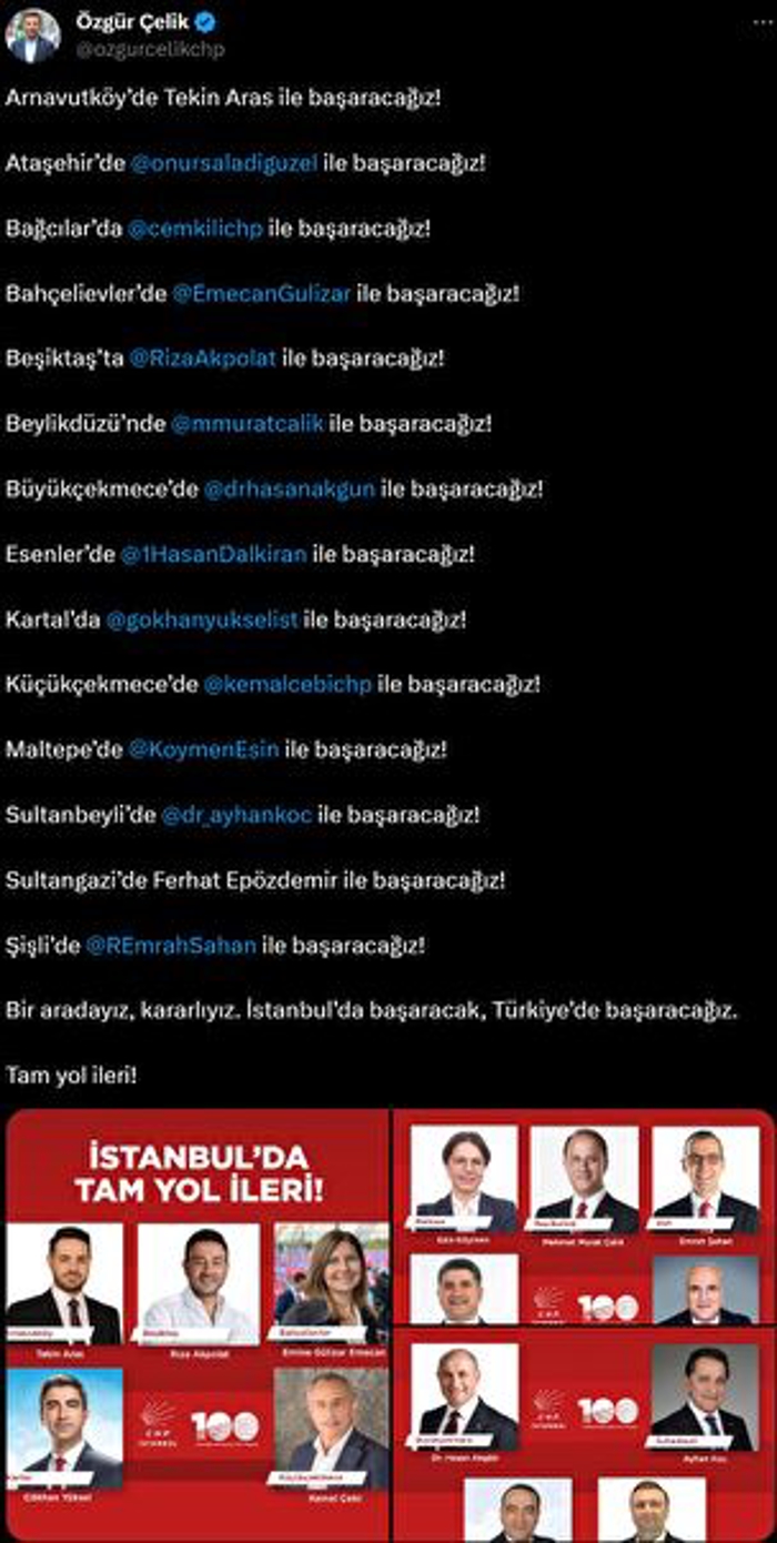 CHP İstanbul İl Başkanı Özgür Çelik, sızdırılan bilgi sonrasında yaptığı X paylaşımında adayları duyurdu.