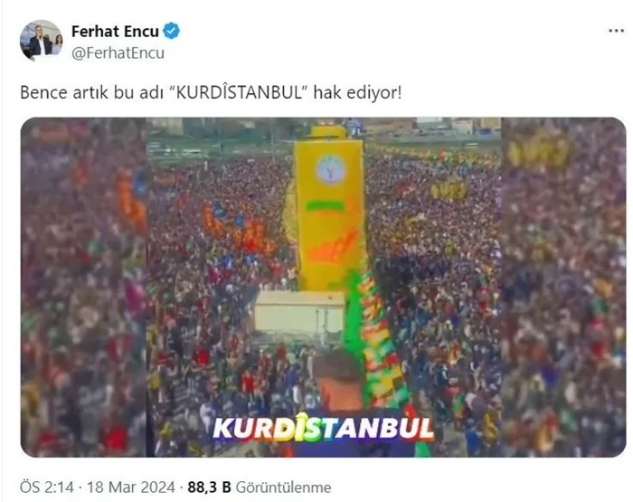 "İstanbul, bence artık 'Kurdİstanbul' adını hak ediyor" diyen CHP'nin ittifak ortağı DEM'li Ferhat Encü'ye sosyal medyadan tepki yağdı.