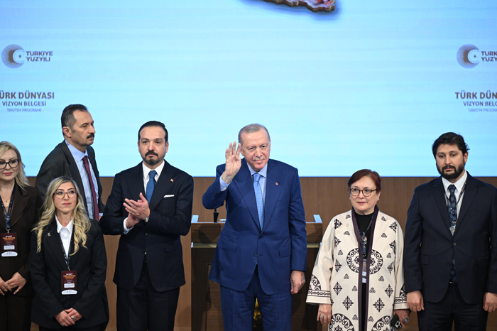 Burada konuşan Erdoğan, Türk Dünyası Vizyon Belgesi Tanıtım toplantısının Türk dünyası ve tüm insanlık için hayırlara vesile olmasını diledi.