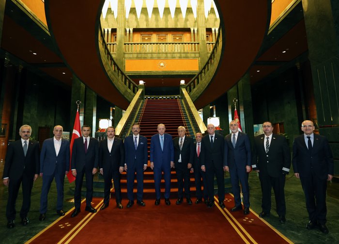 Cumhurbaşkanı Erdoğan, 1 Mayıs Emek ve Dayanışma Günü dolayısıyla işçi, memur ve işveren temsilcilerini Cumhurbaşkanlığı Külliyesi'nde kabul etti.