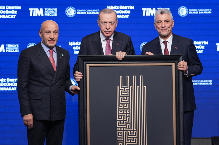 Konuşmaların ardından Ticaret Bakanı Ömer Bolat ve TİM Başkanı Mustafa Gültepe, Cumhurbaşkanı Erdoğan'a sanatçı Bilal Akkaya'nın modern hat tekniğiyle hazırladığı Zümer Suresi'ndeki "Bilenlerle bilmeyenler hiç bir olur mu?" yazılı 9. ayetin yer aldığı tabloyu takdim etti.