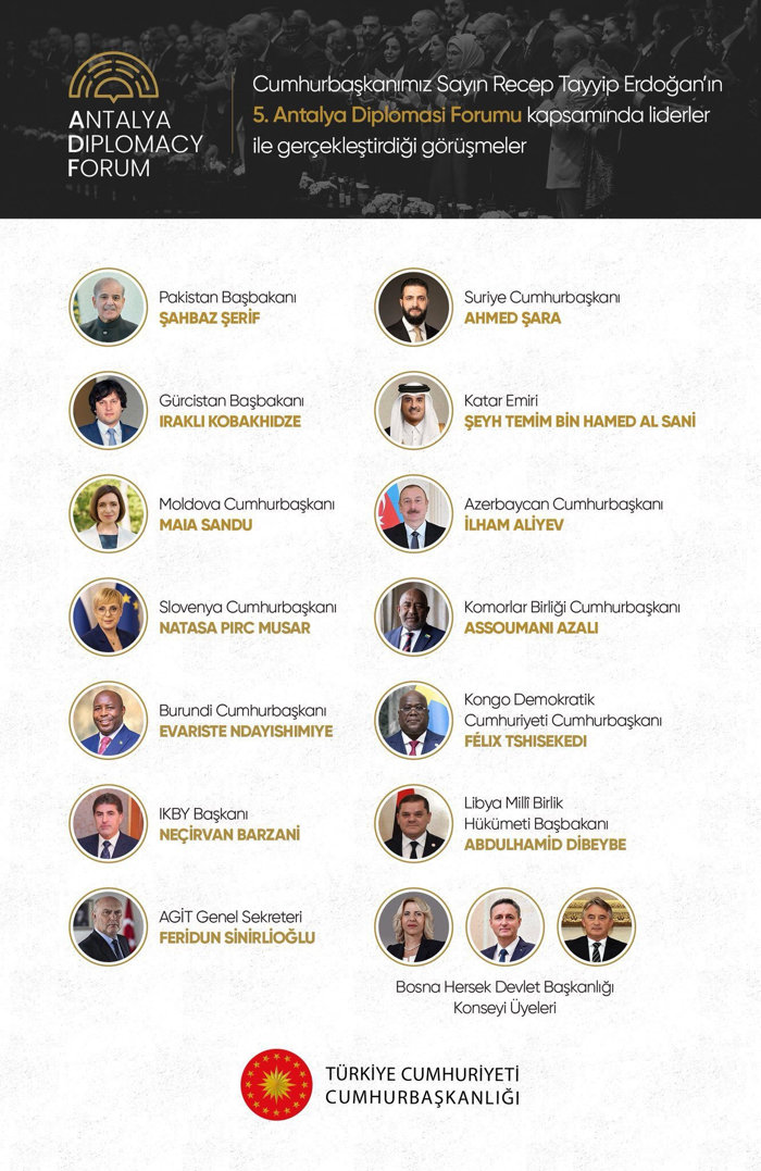 Cumhurbaşkanı Recep Tayyip Erdoğan, Antalya Diplomasi Forumu (ADF) kapsamında katılımcı devlet ve hükümet başkanlarıyla ikili görüşmeler gerçekleştirdi.