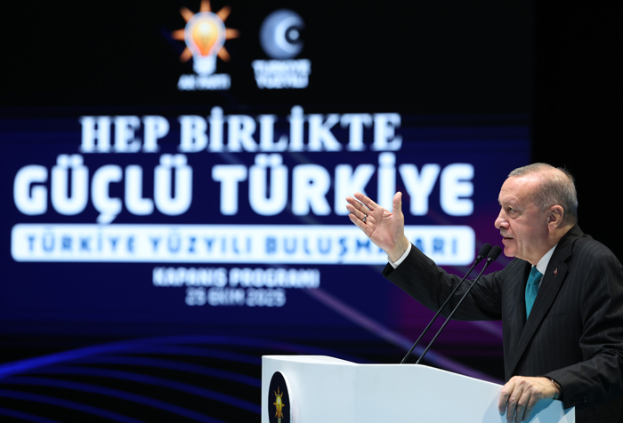 Erdoğan, "Bunu açıkça dillendirmek zorunda kalıyorlar. Suriye'den Gazze'ye, Körfez'den, Rusya-Ukrayna arasındaki çatışmalara kadar hiçbir yerde Türkiyesiz bir denklem kurulamıyor. Artık hem bölgesinde hem dünyada sözüne itibar edilen, çevresine huzur ve istikrar ihraç eden bir Türkiye var. Barışın, kardeşliğin, kalkınmanın ve adaletin egemen olduğu 'Türkiye Yüzyılı' vizyonumuzu kuvveden fiile çıkarma yolunda tarihi bir eşikteyiz. AK Parti ve Cumhur İttifakı olarak bütün enerjimizi, bütün dikkatimizi bu vizyona yoğunlaştırmış durumdayız. Karşılaştığımız direnç, en fazla süreyi biraz uzatır ama bu vizyonun tüm unsurlarıyla hayata geçmesini engelleyemez." şeklinde konuştu.