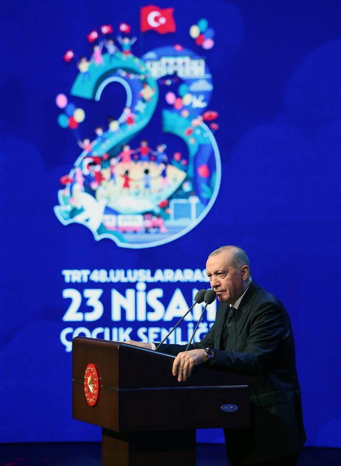 Erdoğan, Beştepe Millet Kongre ve Kültür Merkezi'nde düzenlenen TRT 48. Uluslararası 23 Nisan Çocuk Şenliği Gala Programı'nda yaptığı konuşmada, çocukların 23 Nisan Milli Egemenlik ve Çocuk Bayramı'nı tebrik etti.