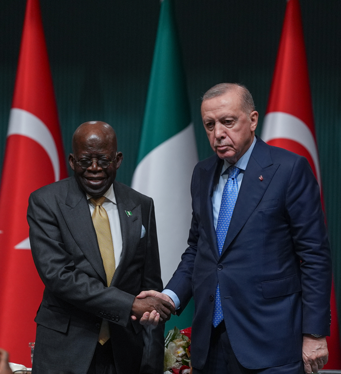 "Nijerya, aynı zamanda İslam İşbirliği Teşkilatı ve D-8 bünyesinde Filistin başta olmak üzere İslam dünyasını ilgilendiren birçok konuda yakın işbirliği halinde olduğumuz stratejik önemde bir ülkedir. Sayın Cumhurbaşkanı ve kıymetli heyetiyle ticaret, yatırımlar, enerji, eğitim ve savunma sanayisi alanlarındaki ilişkilerimizi bugün etraflıca değerlendirdik. Hatırlayacaksınız, 2021'in ekim ayında Nijerya'ya yaptığım ziyaretle çerçevesini çizdiğimiz işbirliğimizi çok daha ileri taşıyacak kararlar aldık. Bu noktada bizim gibi Nijerya tarafında da güçlü bir siyasi irade ve kararlılık olduğunu memnuniyetle müşahede ediyorum. Sayın Cumhurbaşkanına çok sayıda bakan ve üst düzeyli yetkilinin refakat etmesi, bu siyasi kararlılığın en açık emaresidir."