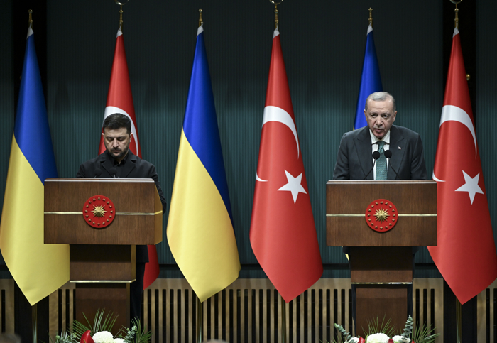 Erdoğan, Cumhurbaşkanlığı Külliyesi'nde, Ukrayna Devlet Başkanı Volodimir Zelenskiy ile düzenlediği ortak basın toplantısında, Zelenskiy'i Türkiye'de ağırlamaktan büyük bir memnuniyet duyduklarını belirtti.