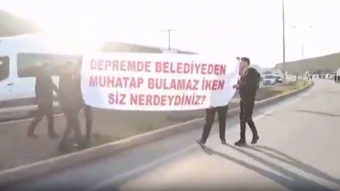 Ellerinde pankartlar taşıyan bir grup depremzede, Özel'in konvoyuna "Bugüne kadar neredeydin?" sloganlarıyla tepki gösterdi.